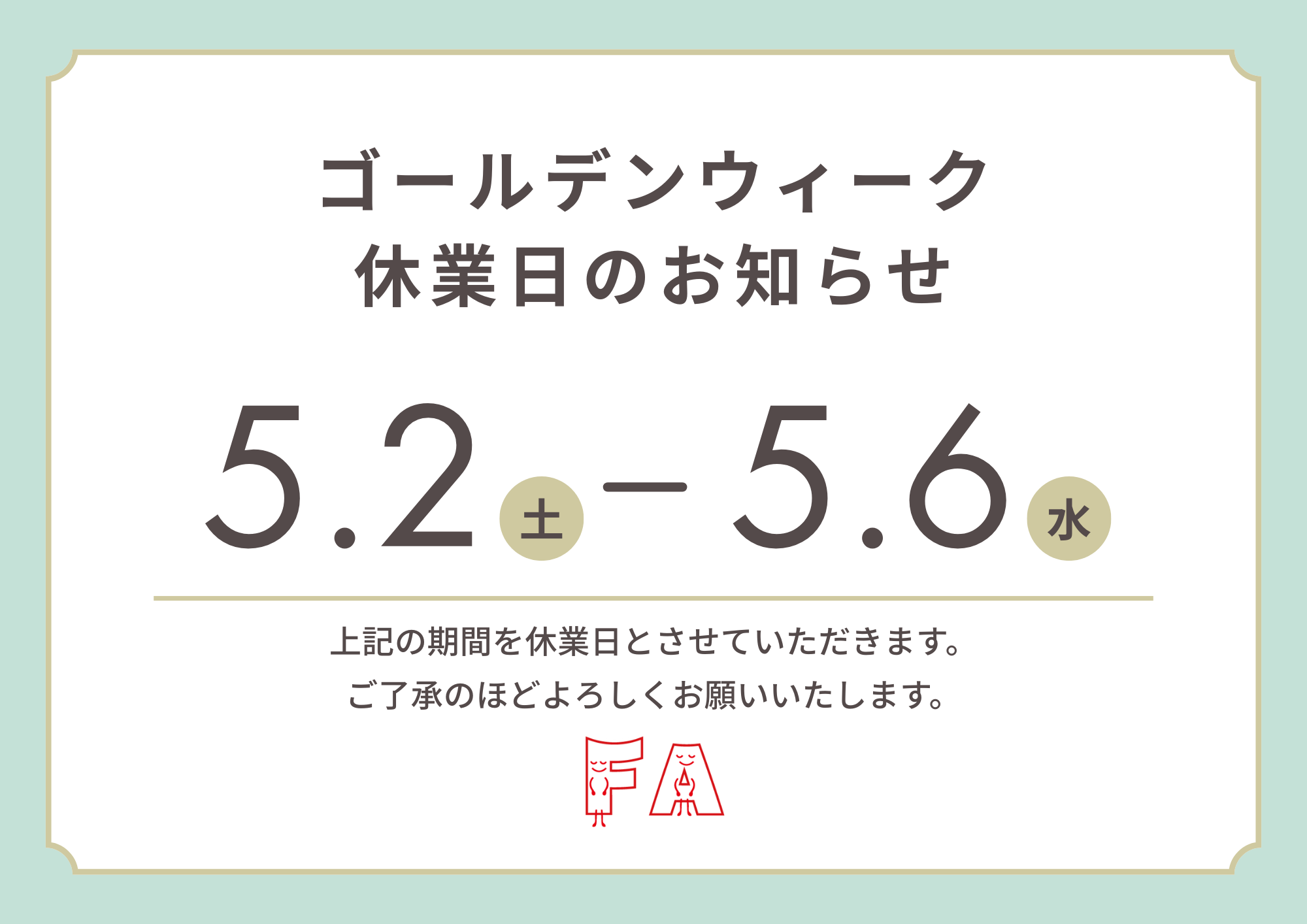 • 5月2日(土) ~ 5月6日(水) 休業日